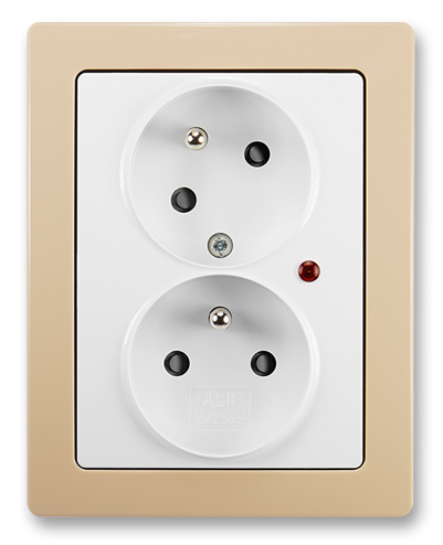 Zásuvka dvojnásobná s ochrannými kolíky, s clonkami, s natočenou dutinou, s ochranou před přepětím, 2x2P+PE, barva jasně bílá / mocca, designová řada Swing®L od ABB