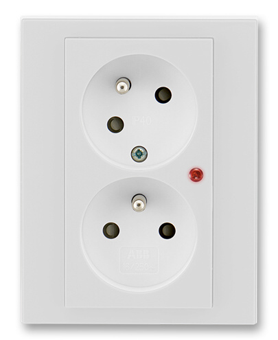 Zásuvka dvojnásobná s ochrannými kolíky, s clonkami, s natočenou dutinou, s ochranou před přepětím. Optická signalizace poruchy. Bezšroubové připojení vodičů (pro vodiče 1,5-2,5 mm2 Cu).