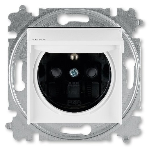 Jednonásobná zásuvka s clonkami a víčkem, s krytím IP44 a bezšroubovými svorkami. Barevné provedení: bílá/kouřově černá. 2P+PE. Připojení vodičů bez šroubů