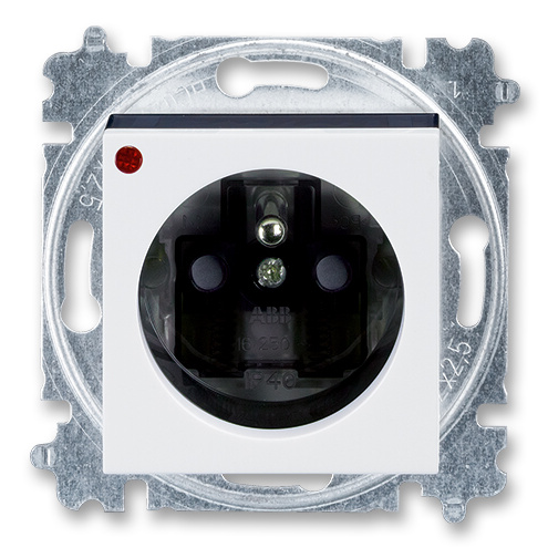 Zásuvka jednonásobná s ochranným kolíkem, s clonkami, s ochranou před přepětím. Optická signalizace poruchy. Bezšroubové připojení vodičů (pro vodiče 1,5-2,5 mm2).