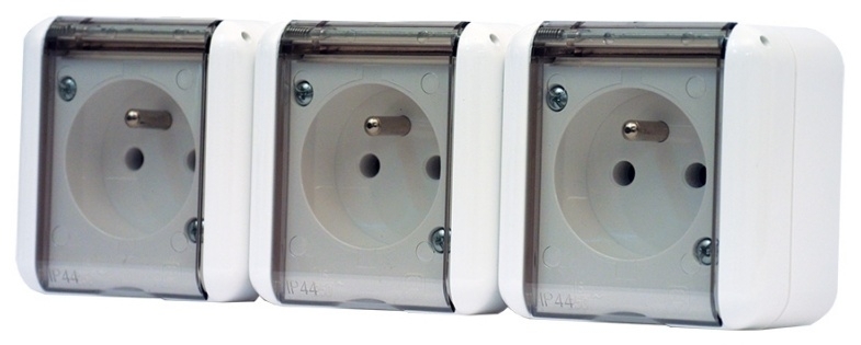 Trojitá zásuvka na povrch s průhledným víčkem. Šroubové svorky.