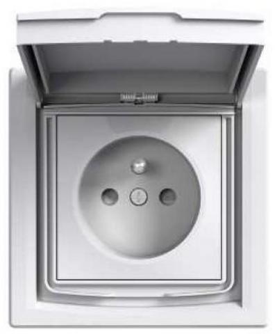 Jednonásobná zásuvka se zemnicím kolíkem, dětskými clonkami a krytkou. Šroubové svorky. Vodiče: 2 x 2,5 mm2 pevné/lankové vodiče.