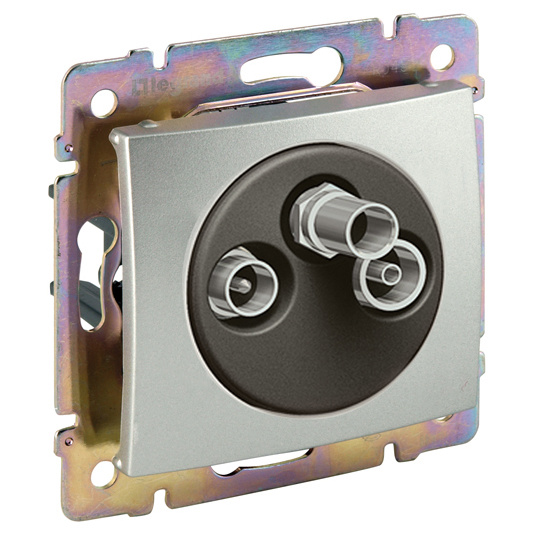 Zásuvka TV-RD-SAT. Mechanismy s kovovou montážní deskou. Montáž do přístrojových krabic pomocí šroubů nebo příchytek. Dodávané bez rámečku. TV „samec" průměr 9,5 mm, 4 – 68 MHz a 120 – 862 MHz. RD „samice" průměr 9,5 mm, 87,5 – 108 MHz. SAT typ „F", 950 – 2400MHz, umožňuje zpětný průchod proudu 500 mA DC.
