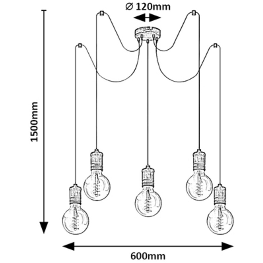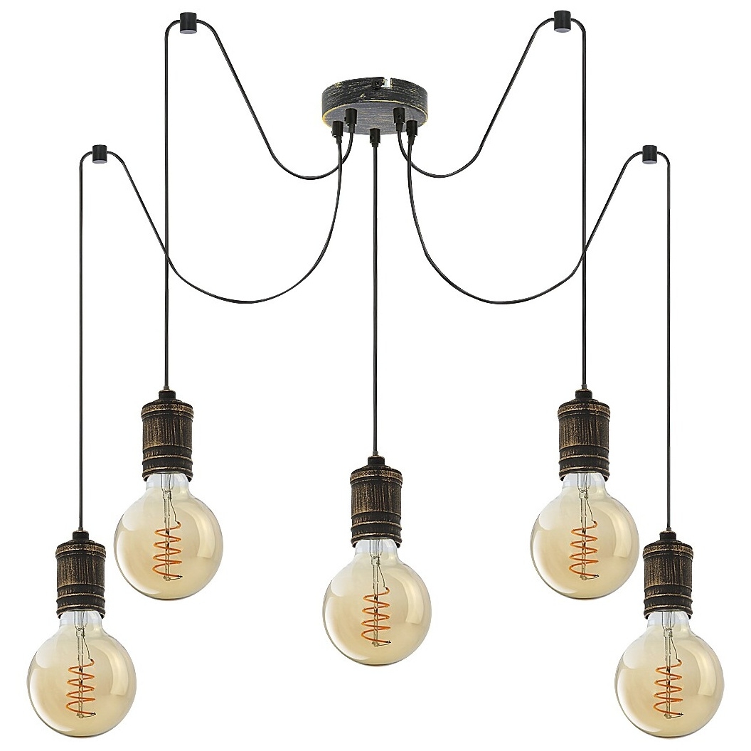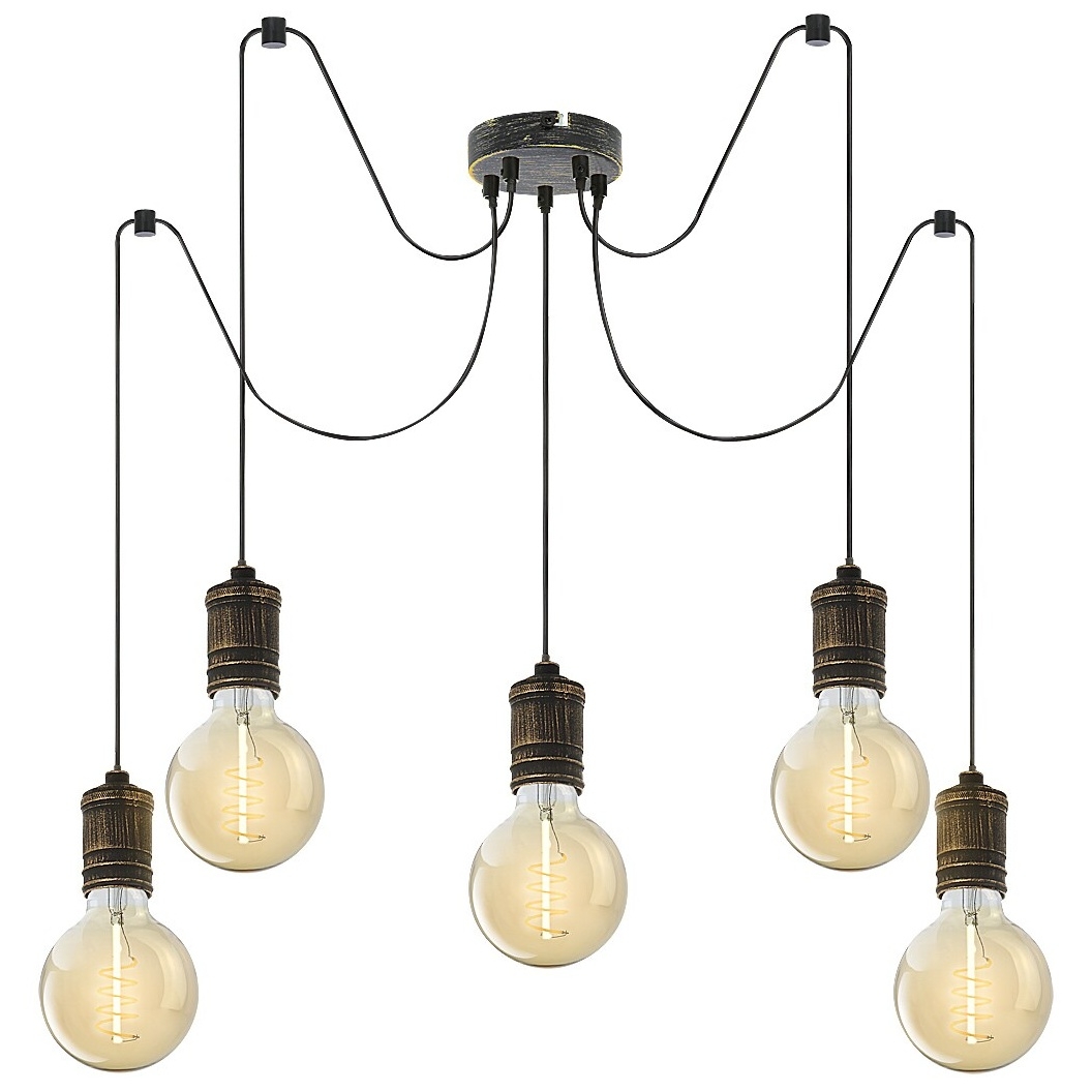 Industriální závěsné svítidlo Fidel s 5 žárovkami bude charakteristickým kouskem vašeho obývacího pokoje, ložnice nebo jídelny. Starožitné kovové svítidlo zlaté barvy lze upevnit na strop pomocí malé kulaté dekorativní základny. Každá z 5 hlav svítidla má patici E27, ve které jsou světelné zdroje volně umístěny. Svítidlo Fidel lze použít s 5 žárovkami, každá s výkonem do 25W. V závislosti na vašem vkusu a místě instalace si můžete pro toto svítidlo zvolit teplé nebo přírodní bílé zdroje světla. S tímto modelem můžete efektivně osvětlit i větší místnost, neboť světlo nestíněných žárovek může volně proudit všemi směry. Průměr závěsného svítidla Fidel s 5 žárovkami je 600mm, vzdálenost od stropu je 1500mm, instalační průměr je 120mm. Tento model je dodáván bez světelných zdrojů.