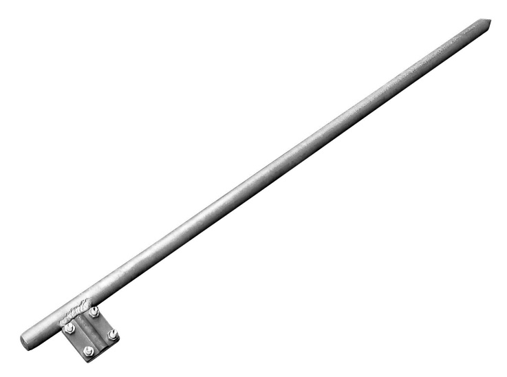 Zemnící tyč se svorkou. Umožňuje průchod výboje do vodivých vrstev země. Délka: 1000 mm; průměr: 25 mm